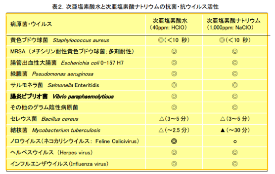 つまり次亜塩素酸水と次亜塩素酸ナトリウムは酸性・アルカリ性の違いはあれど対応できる菌やウイルスについては非常によく似た結果を示すということです。